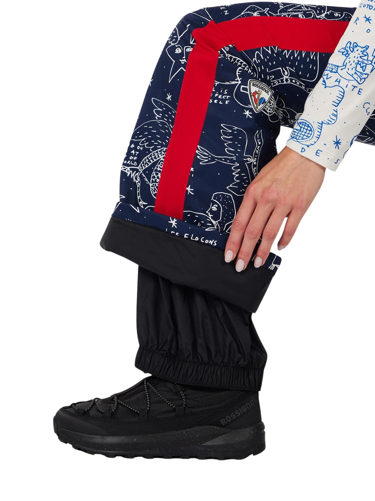 Spodnie zostały wykonane w 100% z materiałów pochodzących z recyklingu, wykończone trwałą impregnacją DWR wolną od PFC i wyposażone w praktyczne detale narciarskie: zintegrowane getry przeciwśnieżne, kieszeń na nogawce, wodoodporne zamki oraz naszywkę JCC x Rossignol na łydce.